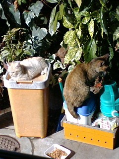 チビは、ゴミ箱の上