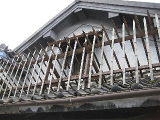 屋根にのっているとがった竹は