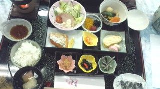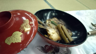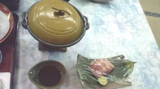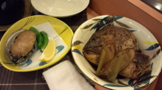 ふぐの一人用鍋。アワビの陶板焼き。鯛のかぶと煮。