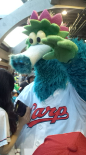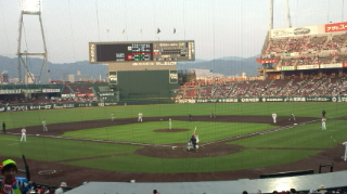 途中、外野の上の通路を赤い帽子の小学生が列をくんで歩いています。